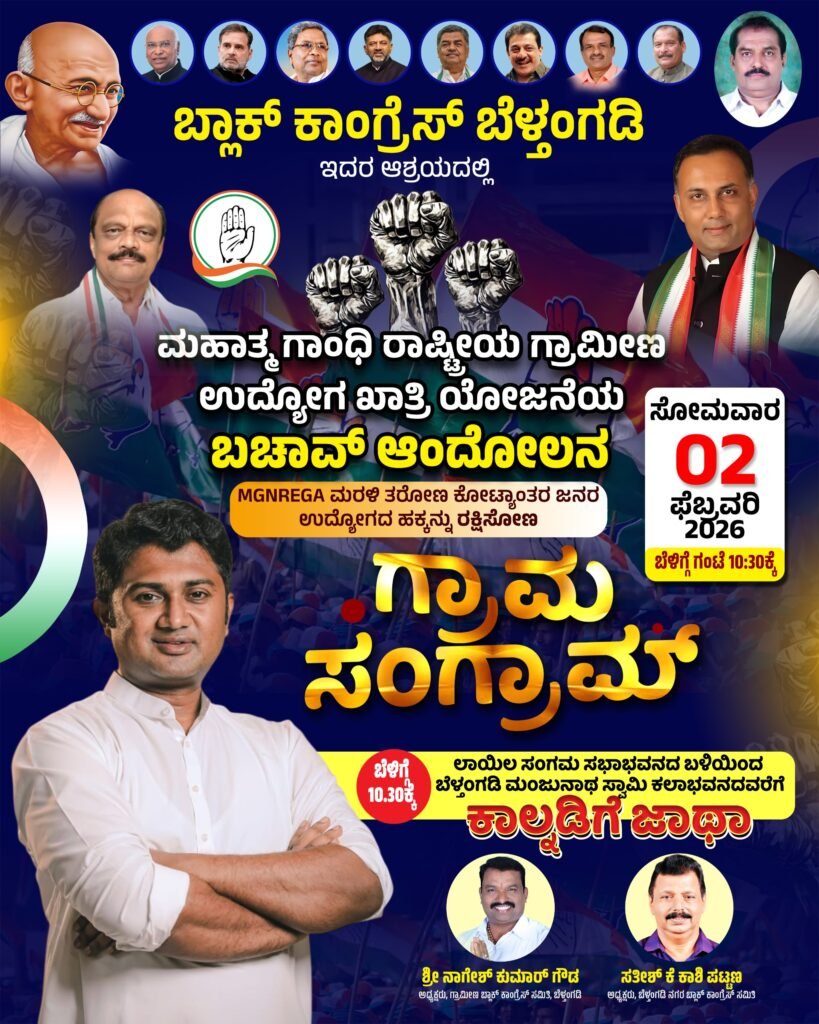 ಬೆಳ್ತಂಗಡಿ, ಜ. 29 : ಬೆಳ್ತಂಗಡಿ ಬ್ಲಾಕ್ ಕಾಂಗ್ರೆಸ್ ವತಿಯಿಂದ ಮಹಾತ್ಮ ಗಾಂಧಿ ರಾಷ್ಟ್ರೀಯ ಗ್ರಾಮೀಣ ಉದ್ಯೋಗ ಖಾತ್ರಿ ಯೋಜನೆಯ ಬಚಾವ್ ಆಂದೋಲನವು ಫೆ. 02ರ ಸೋಮವಾರದಂದು ನಡೆಯಲಿದೆ. ಈ ಆಂದೋಲನ ಸಭೆಯಲ್ಲಿ ಚಿಕ್ಕಬಳ್ಳಾಪುರ ಕ್ಷೇತ್ರದ ಶಾಸಕ, ಪರಿಶ್ರಮ ನೀಟ್ ಅಕಾಡೆಮಿಯ ಸಂಸ್ಥಾಪಕರಾದ ಪ್ರದೀಪ್ ಈಶ್ವರ್ ಭಾಗವಹಿಸಲಿದ್ದಾರೆ ಎಂದು ಬೆಳ್ತಂಗಡಿ ನಗರ ಬ್ಲಾಕ್ ಕಾಂಗ್ರೆಸ್ ಸಮಿತಿ ಅಧ್ಯಕ್ಷರಾದ ಸತೀಶ್ ಕೆ ಕಾಶಿಪಟ್ನ ಮಾಹಿತಿ ನೀಡಿದ್ದಾರೆ.