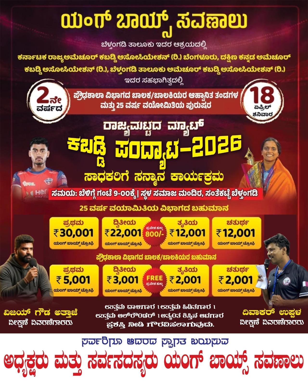ಬೆಳ್ತಂಗಡಿ : ಯ೦ಗ್ ಬಾಯ್ಸ್ ಸವಣಾಲು ಬೆಳ್ತಂಗಡಿ ತಾಲೂಕು ಇದರ ಆಶ್ರಯದಲ್ಲಿ ಏ.18ರಂದು 2ನೇ ವರ್ಷದ “ರಾಜ್ಯಮಟ್ಟದ ಮ್ಯಾಟ್ ಕಬಡ್ಡಿ ಪಂದ್ಯಾಟ”