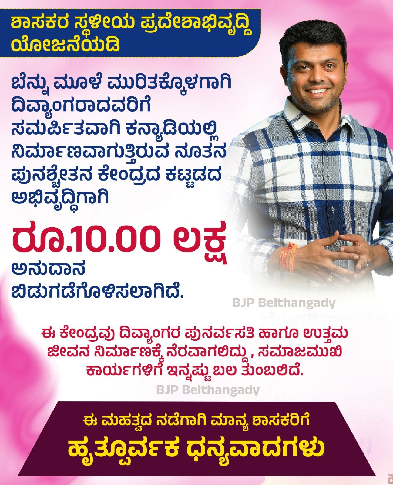 ಬೆಳ್ತಂಗಡಿ : ಶಾಸಕ ಹರೀಶ್ ಪೂಂಜಾರಿಂದ ಕನ್ಯಾಡಿಯ ನೂತನ ಪುನಶ್ಚೇತನ ಕೇಂದ್ರದ ಕಟ್ಟಡದ ಅಭಿವೃದ್ಧಿಗಾಗಿ ರೂ.10.00 ಲಕ್ಷ ಅನುದಾನ