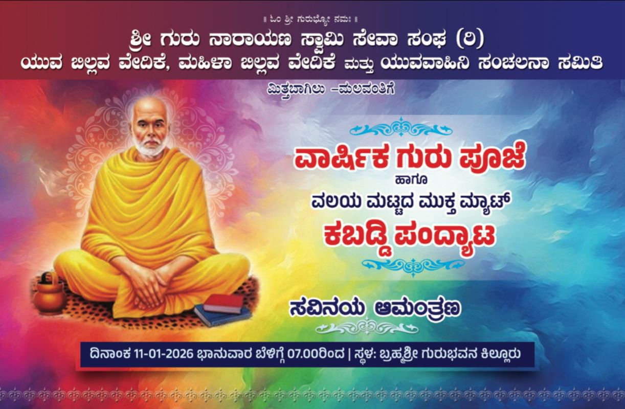 ಬೆಳ್ತಂಗಡಿ : ಜ. 11ರಂದು ಬ್ರಹ್ಮಶ್ರೀ ಗುರುಭವನ ಕಿಲ್ಲೂರಿನಲ್ಲಿ ವಾರ್ಷಿಕ ಗುರು ಪೂಜೆ ಹಾಗೂ ವಲಯ ಮಟ್ಟದ ಮುಕ್ತ ಮ್ಯಾಟ್ ಕಬಡ್ಡಿ ಪಂದ್ಯಾಟ