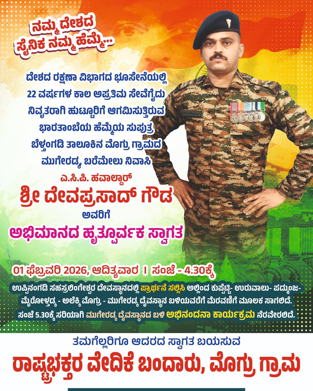 ಬೆಳ್ತಂಗಡಿ : ಸೇನಾ ನಿವೃತ್ತಿ ಹೊಂದಿ ಹುಟ್ಟೂರಿಗೆ ಆಗಮಿಸುತ್ತಿರುವ ಎ.ಸಿ.ಪಿ ಹವಾಲ್ದಾರ್ ದೇವಕುಮಾರ್ ಗೌಡ’ರವರಿಗೆ ನಾಳೆ ಸಂಜೆ ಅಭಿನಂದನಾ ಕಾರ್ಯಕ್ರಮ