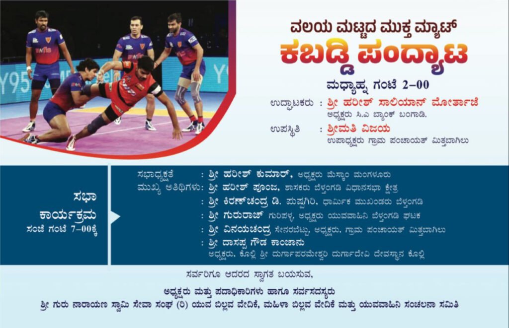 ಮಧ್ಯಾಹ್ನ 2 ಗಂಟೆಗೆ ವಲಯ ಮಟ್ಟದ ಮುಕ್ತ ಮ್ಯಾಟ್ ಕಬಡ್ಡಿ ಪಂದ್ಯಾಟ ಆರಂಭಗೊಳ್ಳಲಿದೆ. ಸಿ.ಎ ಬ್ಯಾಂಕ್ ಬಂಗಾಡಿ ಇದರ ಅಧ್ಯಕ್ಷರಾಗಿರುವ ಶ್ರೀ ಹರೀಶ್ ಸಾಲಿಯಾನ್ ಮೋರ್ತಾಜೆ ಇವರು ಉದ್ಘಾಟನೆ ನೆರವೇರಿಸಲಿದ್ದಾರೆ. ಜೊತೆಗೆ ಮಿತ್ತಬಾಗಿಲು ಗ್ರಾಮ ಪಂಚಾಯತ್ ಉಪಾಧ್ಯಕ್ಷರಾದ ಶ್ರೀಮತಿ ವಿಜಯ ಇವರು ಗೌರವ ಉಪಸ್ಥಿತಿ ಇರಲಿದ್ದಾರೆ.