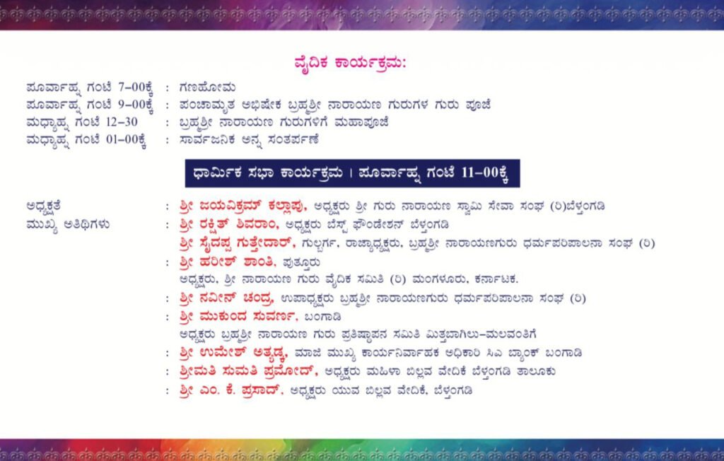 ಬೆಳಿಗ್ಗೆ 7 ವೈದಿಕ ಕಾರ್ಯಕ್ರಮಗಳು, ಬೆ. 9 ಗಂಟೆಗೆ ಪಂಚಾಮೃತ ಅಭಿಷೇಕ ಬ್ರಹ್ಮಶ್ರೀ ನಾರಾಯಣ ಗುರುಗಳ ಗುರು ಪೂಜೆ, ಮಧ್ಯಾಹ್ನ 12-30ಕ್ಕೆ ಬ್ರಹ್ಮಶ್ರೀ ನಾರಾಯಣ ಗುರುಗಳಿಗೆ ಮಹಾಪೂಜೆ ಆ ಬಳಿಕ ಸಾರ್ವಜನಿಕ ಅನ್ನಸಂತರ್ಪಣೆ ಜರುಗಲಿದೆ ಎಂದು ಸಂಘಟಕರು ಮಾಹಿತಿ ನೀಡಿದ್ದಾರೆ. ಬೆ. 11 ಗಂಟೆಗೆ ಶ್ರೀ ಗುರು ನಾರಾಯಣ ಸ್ವಾಮಿ ಸೇವಾ ಸಂಘ (ರಿ)ಬೆಳ್ತಂಗಡಿ ಅಧ್ಯಕ್ಷರಾದ ಶ್ರೀ ಜಯವಿಕ್ರಮ್ ಕಲ್ಲಾಪು ಇವರ ಅಧ್ಯಕ್ಷತೆಯಲ್ಲಿ ಸಭಾ ಕಾರ್ಯಕ್ರಮವು ಜರುಗಲಿದೆ.