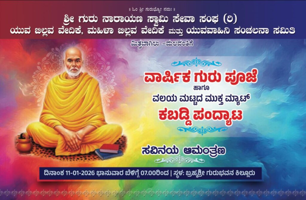 ಕಿಲ್ಲೂರು, ಜ. 09 : ಶ್ರೀ ಗುರು ನಾರಾಯಣ ಸ್ವಾಮಿ ಸೇವಾ ಸಂಘ (ರಿ) ಯುವ ಬಿಲ್ಲವ ವೇದಿಕೆ, ಮಹಿಳಾ ಬಿಲ್ಲವ ವೇದಿಕೆ ಮತ್ತು ಯುವವಾಹಿನಿ ಸಂಚಲನಾ ಸಮಿತಿ ಮಿತ್ತಬಾಗಿಲು -ಮಲವಂತಿಗೆ ವತಿಯಿಂದ ವಾರ್ಷಿಕ ಗುರು ಪೂಜೆ ಹಾಗೂ ವಲಯ ಮಟ್ಟದ ಮುಕ್ತ ಮ್ಯಾಟ್ ಕಬಡ್ಡಿ ಪಂದ್ಯಾಟವು ಜನವರಿ 11ರಂದು ಬ್ರಹ್ಮಶ್ರೀ ಗುರುಭವನ ಕಿಲ್ಲೂರಿನಲ್ಲಿ ಜರುಗಲಿದೆ.