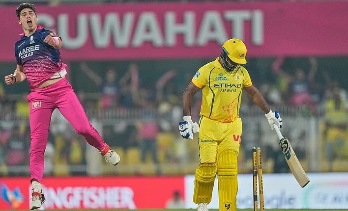 ಇದಕ್ಕೂ ಮೊದಲು ಚೆನ್ನೈ ಸೂಪರ್ ಕಿಂಗ್ಸ್ ತಂಡ ರಾಜಸ್ಥಾನದ ವೇಗಿಗಳಾದ ನ್ಯಾಂಡ್ರೆ ಬರ್ಗರ್ ಮತ್ತು ಜೋಫ್ರಾ ಆರ್ಚರ್ ಅವರ ಮೊನಚಾದ ದಾಳಿಗೆ ಒದ್ದಾಡಿದರು. ಬರ್ಗರ್ ಅವರು 2ನೇ ಓವರ್ ನ ಕೊನೇ ಎಸೆತದಲ್ಲಿ ಸಂಜು ಸ್ಯಾಮ್ಸನ್(7 ಎಸೆತದಲ್ಲಿ 6 ರನ್) ಅವರನ್ನು ಕ್ಲೀನ್ ಬೌಲ್ಡ್ ಮಾಡುವ ಮೂಲಕ ಚೆನ್ನೈಗೆ ಮೊದಲ ಆಘಾತ ನೀಡಿದರು. ಆ ಬಳಿಕ 3ನೇ ಓವರ್ ನ ಕೊನೇ ಎಸೆತದಲ್ಲಿ ಜೋಫ್ರಾ ಆರ್ಚರ್ ಅವರು ನಾಯಕ ರುತುರಾಜ್ ಗಾಯಕ್ನಾಡ್ (11 ಎಸೆತದಲ್ಲಿ 6) ಅವರ ವಿಕೆಟ್ ಅನ್ನು ಎಗರಿಸಿದರು. 4ನೇ ಓವರ್ ನ ಮೊದಲ ಎಸೆತದಲ್ಲಿ ಬರ್ಗರ್ ಅವರು ಆಯುಷ್ ಮ್ಹಾತ್ರೆ ಅವರನ್ನು ಖಾತೆ ತೆರೆಯುವ ಮೊದಲೇ ಔಟ್ ಮಾಡಿದರು. ಹೀಗಾಗಿ ಚೆನ್ನೈ ಸೂಪರ್ ಕಿಂಗ್ಸ್ ತಂಡದ ರನ್ ರೇಟ್ ಸಂಪೂರ್ಣ ಬಿತ್ತು. ಜೊತೆಗೆ ವಿಕೆಟ್ ಗಳೂ ಪಟಪಟನೇ ಬೀಳುತ್ತಾ ಹೋದವು. ಒಂದು ಹಂತದಲ್ಲಂತೂ ತಂಡ 100ರ ಗಡಿ ದಾಟುವುದೇ ಕಷ್ಟ ಎಂಬ ಪರಿಸ್ಥಿತಿ ನಿರ್ಮಾಣವಾಗಿತ್ತು.