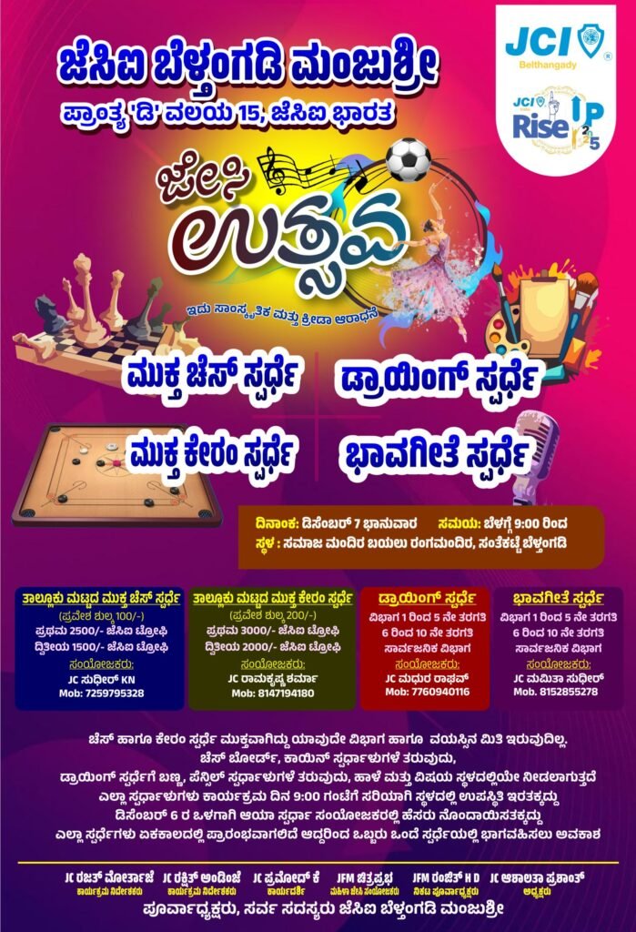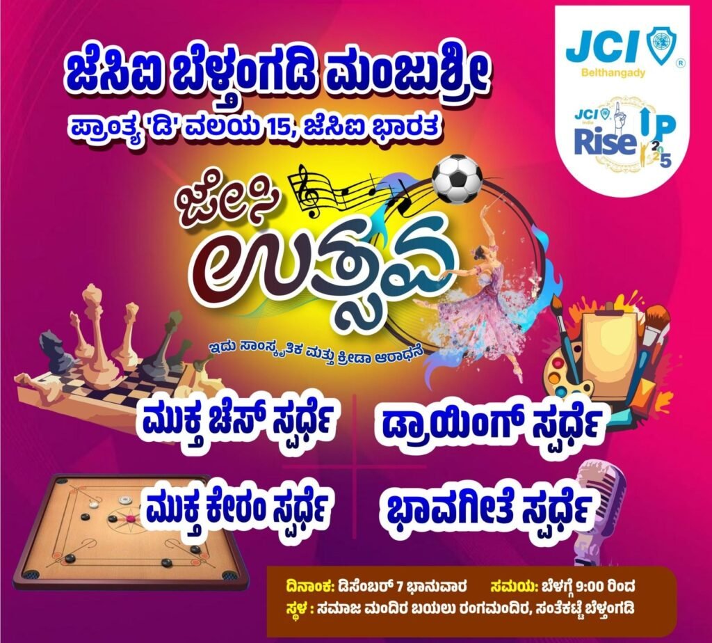 ಬೆಳ್ತಂಗಡಿ : ಜೆಸಿಐ ಬೆಳ್ತಂಗಡಿ ಮಂಜುಶ್ರೀ ಪ್ರಾಂತ್ಯ ಡಿ ವಲಯ 15, ಜೆಸಿಐ ಭಾರತ ಆಶ್ರಯದಲ್ಲಿ ಜೆಸಿ ಉತ್ಸವದಂಗವಾಗಿ ಡಿಸೆಂಬರ್ 7 ಭಾನುವಾರದಂದು ಬೆಳಗ್ಗೆ 9 ಗಂಟೆಯಿಂದ ಬೆಳ್ತಂಗಡಿ ಸಂತೆಕಟ್ಟೆಯ ಸಮಾಜಮಂದಿರ ಬಯಲು ರಂಗಮಂದಿರದಲ್ಲಿ ತಾಲೂಕು ಮಟ್ಟದ ಮುಕ್ತ ಚೆಸ್ ಸ್ಪರ್ಧೆ, ತಾಲೂಕು ಮಟ್ಟದ ಮುಕ್ತ ಕೇರಂ ಸ್ಪರ್ಧೆ, ಡ್ರಾಯಿಂಗ್ ಸ್ಪರ್ಧೆ ಹಾಗೂ ಭಾವಗೀತೆ ಸ್ಪರ್ಧೆ ನಡೆಯಲಿದೆ.