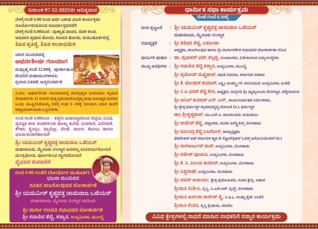 ಅರ್ಧ ಏಕಾಹ ಭಜನೆ ಕಾರ್ಯಕ್ರಮ, ಪುಣ್ಯಾಹ ವಾಚನ, ನವಕ ಕಲಶ, ಅಧಿವಾಸ ಪ್ರಧಾನ ಹೋಮ, ಗಣಪತಿ ಹೋಮ, ಸುಮಹೂರ್ತದಲ್ಲಿ ಶಿಖರ ಪ್ರತಿಷ್ಠೆ, ಶಿಖರ ಕಲಶಾಭಿಷೇಕ, ಯಾಗ ಮಂಟಪದಲ್ಲಿ ಅಥರ್ವ ಶೀರ್ಷ ಗಣಯಾಗ ಸೇರಿದಂತೆ ವಿವಿಧ ವೈದಿಕ ಕಾರ್ಯಕ್ರಮಗಳು ಜರುಗಲಿದೆ. ಸಂಜೆ ಗಂಟೆ 04:00ರಿಂದ ಜಿಲ್ಲೆಯ ಪ್ರತಿಷ್ಠಿತ ಕಲಾ ತಂಡಗಳಿಂದ ಡೊಳ್ಳು ಕುಣಿತ, ವೀರಗಾಸೆ, ಪಿಲಿನಲಿಕೆ, ಕೌಡಲ ತೈಯ್ಯಂ, ಟ್ಯಾಬ್ಲೋ, ಚೆಂಡೆ, ವಾಲಗ, ಕೊಂಬು ಹಾಗೂ ಭಜನಾ ತಂಡಗಳೊಂದಿಗೆ ಶ್ರೀ ಯದುವೀರ್ ಕೃಷ್ಣದತ್ತ ಚಾಮರಾಜ ಒಡೆಯರ್ ಮಹಾರಾಜರು, ಮಹಾಸಂಸ್ಥಾನಮ್ ಅವರನ್ನು ಯತಿವರ್ಯರೊಂದಿಗೆ ಮಂತ್ರಘೋಷ, ಪೂರ್ಣಕುಂಭ ಸ್ವಾಗತದೊಂದಿಗೆ ವೈಭವದ ಮೆರವಣಿಗೆ ನಡೆಯಲಿದೆ. ಸಂಜೆ 05:30 ಗಂಟೆಗೆ ನೂತನ ರಾಜಗೋಪುರದ ಲೋಕಾರ್ಪಣೆ, ಶ್ರೀ ದುರ್ಗಾ ಗಣಪತಿ ಸಭಾಭವನ ಲೋಕಾರ್ಪಣೆಗೊಳ್ಳಲಿದೆ. ಸಂಜೆ 06:00 ಗಂಟೆಗೆ ಧಾರ್ಮಿಕ ಸಭಾ ಕಾರ್ಯಕ್ರಮ ಹಾಗೂ ಸಾಧಕರಿಗೆ ಸನ್ಮಾನ ಕಾರ್ಯಕ್ರಮವು ನಡೆಯಲಿದೆ.