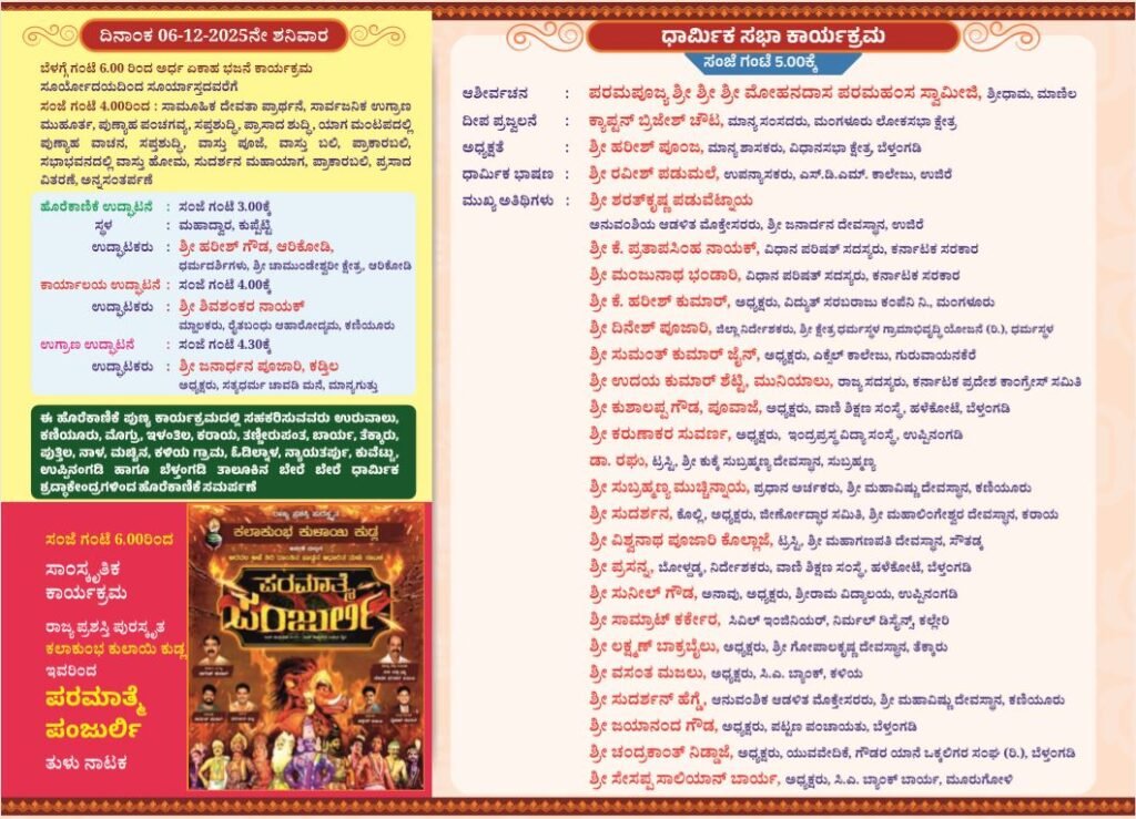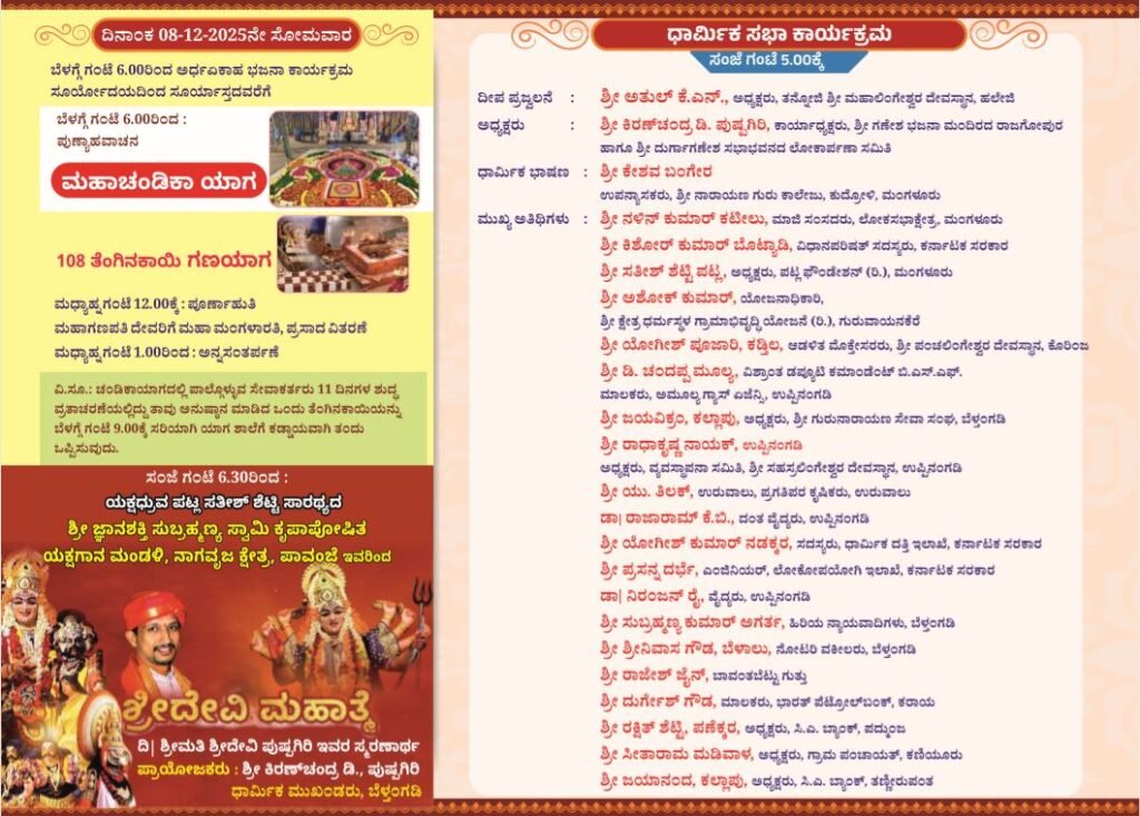 ಕುಪ್ಪೆಟ್ಟಿ : ಶ್ರೀ ಗಣೇಶ ಭಜನಾ ಮಂದಿರ (ರಿ.), ಕುಪ್ಪೆಟ್ಟಿ ಇಲ್ಲಿನ ನೂತನ ರಾಜಗೋಪುರ ಹಾಗೂ ಶ್ರೀ ದುರ್ಗಾಗಣೇಶ ಸಭಾಭವನದ ಲೋಕಾರ್ಪಣೆ, ಅಥರ್ವ ಶೀರ್ಷ ಗಣಯಾಗ ಹಾಗೂ ಮಹಾಚಂಡಿಕಾ ಯಾಗವು ಡಿಸೆಂಬರ್ ೦೬, ೦೭ ಹಾಗೂ ೦೮ರಂದು ವೈಭವದಿಂದ ನಡೆಯಲಿದೆ.