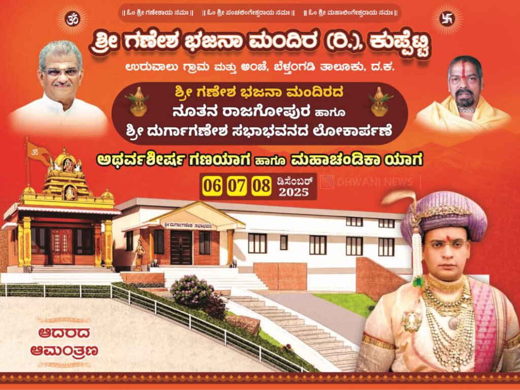 ಕುಪ್ಪೆಟ್ಟಿ : ಶ್ರೀ ಗಣೇಶ ಭಜನಾ ಮಂದಿರ (ರಿ.), ಕುಪ್ಪೆಟ್ಟಿ ಇಲ್ಲಿನ ನೂತನ ರಾಜಗೋಪುರ ಹಾಗೂ ಶ್ರೀ ದುರ್ಗಾಗಣೇಶ ಸಭಾಭವನದ ಲೋಕಾರ್ಪಣೆ, ಅಥರ್ವ ಶೀರ್ಷ ಗಣಯಾಗ ಹಾಗೂ ಮಹಾಚಂಡಿಕಾ ಯಾಗವು ಡಿಸೆಂಬರ್ ೦೬, ೦೭ ಹಾಗೂ ೦೮ರಂದು ವೈಭವದಿಂದ ನಡೆಯಲಿದೆ.