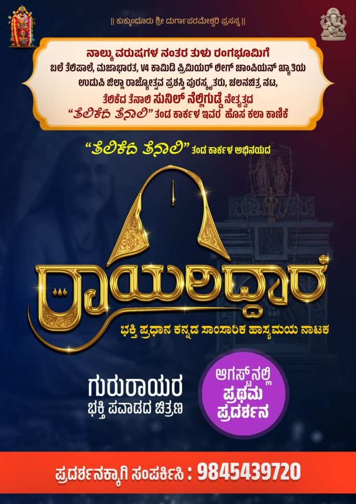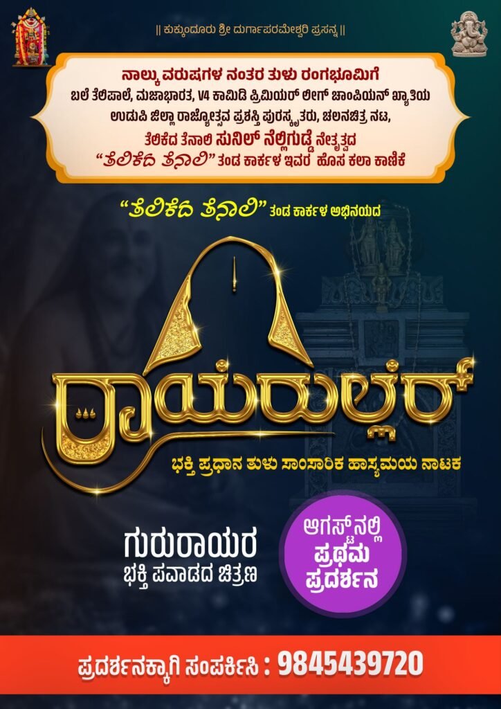 “ತೆಲಿಕೆದ ತಾಲಿ” ತಂಡ ಕಾರ್ಕಳ ಅಭಿನಯದ ತುಳು “ರಾಯರುಲ್ಲೆರ್” ಹಾಗೂ ಕನ್ನಡ “ರಾಯರಿದ್ದಾರೆ” ಎಂಬ ಭಕ್ತಿ ಪ್ರಧಾನ ತುಳು ಸಾಂಸಾರಿಕ ಹಾಸ್ಯಮಯ ನಾಟಕ ‘ಗುರುರಾಯರ ಭಕ್ತಿ ಪವಾಡದ ಚಿತ್ರಣ’ ಆಗಸ್ಟ್ನಲ್ಲಿ ಪ್ರಥಮ ಪ್ರದರ್ಶನಗೊಳ್ಳಲಿದೆ ಎಂದು ತೆಲಿಕೆದ ತೆನಾಲಿ ಸುನಿಲ್ ನೆಲ್ಲಿಗುಡ್ಡೆ ಮಾಹಿತಿ ನೀಡಿದ್ದಾರೆ.