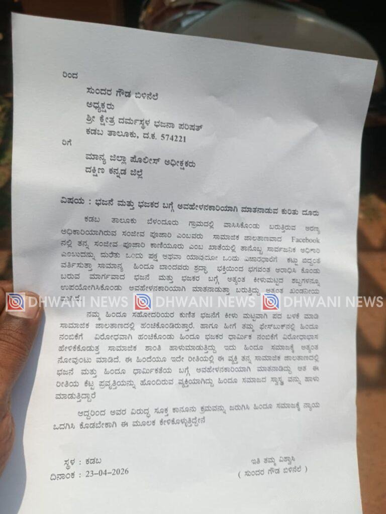 ಕಡಬ, ಏ. 24 : ಭಜನೆ ಹಾಗೂ ಭಜಕರ ಬಗ್ಗೆ ಸಾಮಾಜಿಕ ಜಾಲತಾಣದಲ್ಲಿ ಅವಹೇಳನಕಾರಿಯಾಗಿ ಮಾತನಾಡಿರುವ ಆರೋಪದ ಮೇಲೆ ಅರಣ್ಯ ಅಧಿಕಾರಿಯೊಬ್ಬರ ವಿರುದ್ಧ ಜಿಲ್ಲಾ ಪೊಲೀಸ್ ಅಧೀಕ್ಷಕರಿಗೆ ಕಡಬ ಪೊಲೀಸ್ ಠಾಣೆಯಲ್ಲಿ ದೂರು ನೀಡಿ. ಕಡಬ ದುರ್ಗಾಂಬಿಕಾ ಅಮ್ಮನವರ ದೇವಾಲಯದಲ್ಲಿ ಪ್ರಾರ್ಥನೆಯನ್ನು ಸಲ್ಲಿಸಿದರು.