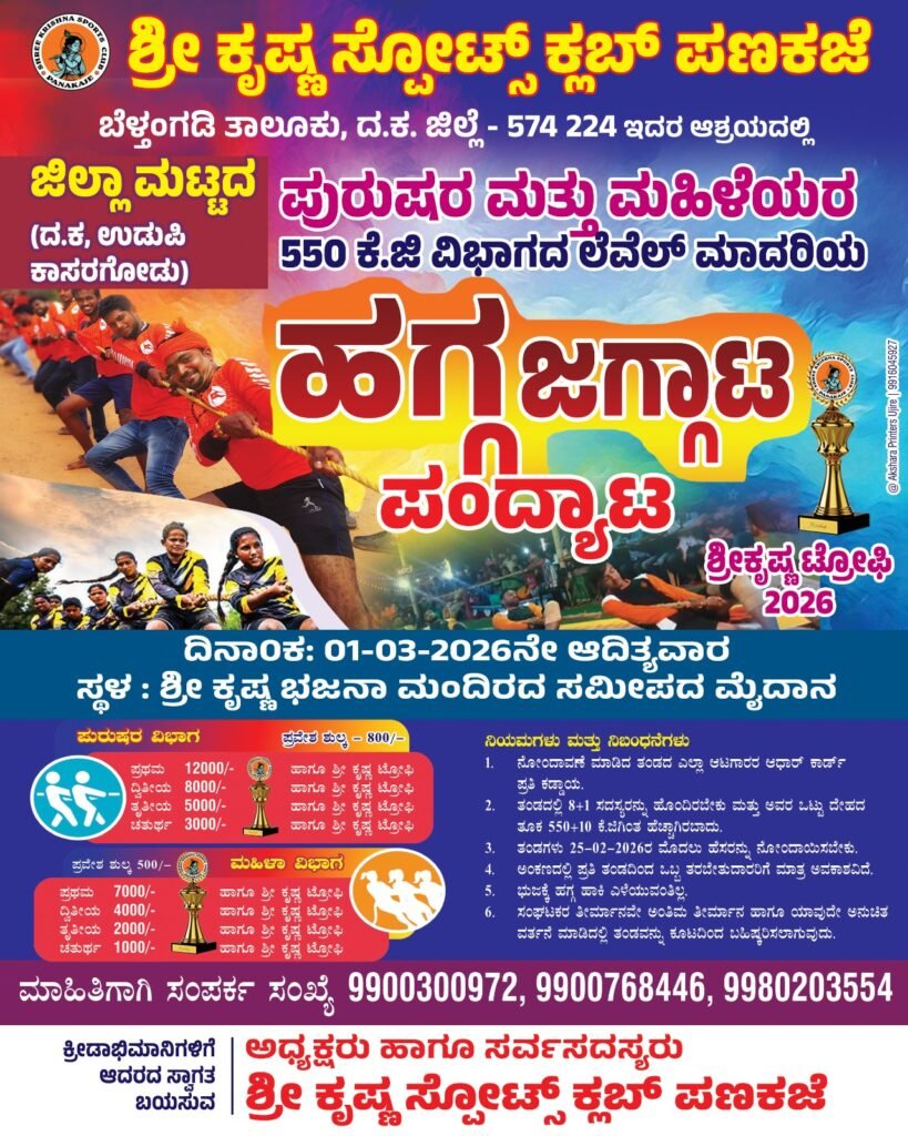 ಪಣಕಜೆ, ಫೆ. 02 : ಶ್ರೀ ಕೃಷ್ಣ ಸ್ಪೋಟ್ಸ್ ಕ್ಲಬ್ ಪಣಕಜೆ ಇದರ ಆಶ್ರಯದಲ್ಲಿ ಜಿಲ್ಲಾಮಟ್ಟದ (ದ.ಕ, ಉಡುಪಿ ಕಾಸರಗೋಡು) ಪುರುಷರ ಮತ್ತು ಮಹಿಳೆಯರ 550 ಕೆ.ಜಿ ವಿಭಾಗದ ಲೆವೆಲ್ ಮಾದರಿಯ ಹಗ್ಗಜಗ್ಗಾಟ ಪಂದ್ಯಾಟ “ಶ್ರೀಕೃಷ್ಣಟ್ರೋಫಿ 2026” ಮಾರ್ಚ್ 01ನೇ ಆದಿತ್ಯವಾರದಂದು ಶ್ರೀ ಕೃಷ್ಣ ಭಜನಾ ಮಂದಿರದ ಸಮೀಪದ ಮೈದಾನದಲ್ಲಿ ನಡೆಯಲಿದೆ. ಈ ಹಗ್ಗಜಗ್ಗಾಟ ಪಂದ್ಯಾಟದ ಆಮಂತ್ರಣ ಪತ್ರಿಕೆಯನ್ನು ಇಂದು ಶ್ರೀ ಕೃಷ್ಣ ಭಜನಾ ಮಂದಿರದ ದಲ್ಲಿ ಬಿಡುಗಡೆಗೊಳಿಸಲಾಯಿತು.