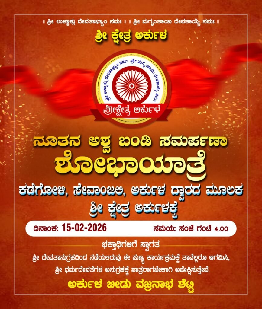 ಕಡೆಗೋಳಿ, ಸೇವಾಂಜಲಿ, ಅರ್ಕುಳ ದ್ವಾರದ ಮೂಲಕ ಶ್ರೀ ಕ್ಷೇತ್ರ ಅರ್ಕುಳಕ್ಕೆ ನೂತನ ಅಶ್ವ ಬಂಡಿ ಸಮರ್ಪಣಾ ಶೋಭಾಯಾತ್ರೆಯು ಸಾಗಿ ಬರಲಿದೆ. ಈ ಅಶ್ವ ಬಂಡಿ ಸಮರ್ಪಣಾ ಶೋಭಾಯಾತ್ರೆಯಲ್ಲಿ ಎಲ್ಲಾ ಭಗವದ್ಭಕ್ತರು, ಸಂಘ ಸಂಸ್ಥೆಗಳು ಪಾಲ್ಗೊಳ್ಳಬೇಕೆಂದು ಅರ್ಕುಳ ಬೀಡು ವಜ್ರನಾಭ ಶೆಟ್ಟಿ ವಿನಂತಿಸಿಕೊಂಡಿದ್ದಾರೆ.