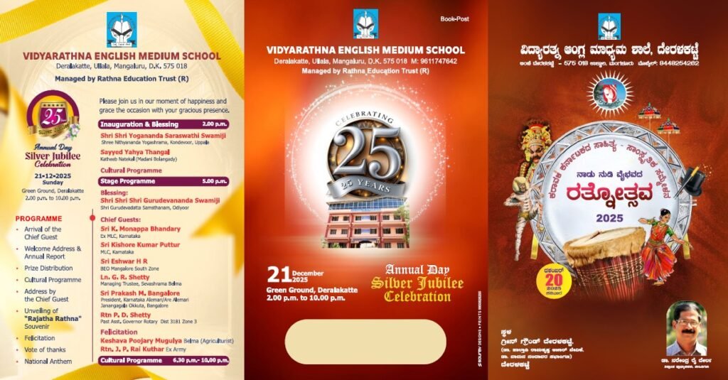 ವಿದ್ಯಾರತ್ನ ಆಂಗ್ಲ ಮಾಧ್ಯಮ ಶಾಲೆ ದೇರಳಕಟ್ಟೆ ಇದರ 25ನೇ ವರ್ಷದ ಬೆಳ್ಳಿ ಹಬ್ಬ ಹಾಗೂ ವಾರ್ಷಿಕೋತ್ಸವ ಕಾರ್ಯಕ್ರಮವು ಡಿ. 21 ರ ಭಾನುವಾರದಂದು ದೇರಳಕಟ್ಟೆಯ ಗ್ರೀನ್ ಗ್ರೌಂಡ್ನಲ್ಲಿ ವಿಜೃಂಭಣೆಯಿಂದ ನಡೆಯಲಿದೆ. ಮಧ್ಯಾಹ್ನ 2.00 ಗಂಟೆಗೆ ಕಾರ್ಯಕ್ರಮದ ಉದ್ಘಾಟನೆ ಮತ್ತು ಆಶೀರ್ವಚನವನ್ನು ಶ್ರೀ ನಿತ್ಯಾನಂದ ಯೋಗಾಶ್ರಮ, ಕೊಂಡೇವೂರು, ಉಪ್ಪಳದ ಶ್ರೀ ಶ್ರೀ ಯೋಗಾನಂದ ಸರಸ್ವತಿ ಸ್ವಾಮೀಜಿ ನೆರವೇರಿಸಲಿದ್ದು ನಾಟೆಕಲ್ (ಮದನಿ ಬೊಳಂಗಡಿ) ಖತೀಬ್ ಸಯ್ಯಿದ್ ಯಹ್ಯಾ ತಂಗಳ್ ಉಪಸ್ಥಿತರಿರುವರು. ಸಂಜೆ 5.00 ಗಂಟೆಗೆ ನಡೆದ ವೇದಿಕೆ ಕಾರ್ಯಕ್ರಮದಲ್ಲಿ ಶ್ರೀ ಗುರುದೇವದತ್ತ ಸಂಸ್ಥಾನ, ಒಡಿಯೂರಿನ ಶ್ರೀ ಶ್ರೀ ಶ್ರೀ ಗುರುದೇವಾನಂದ ಸ್ವಾಮೀಜಿ ಆಶೀರ್ವಚನ ನೀಡಿಲಿದ್ದಾರೆ. ಕಾರ್ಯಕ್ರಮದ ಮುಖ್ಯ ಅತಿಥಿಗಳಾಗಿ ಕರ್ನಾಟಕದ ಮಾಜಿ ವಿಧಾನ ಪರಿಷತ್ ಸದಸ್ಯ ಕೆ. ಮೊನಪ್ಪ ಭಂಡಾರಿ, ವಿಧಾನ ಪರಿಷತ್ ಸದಸ್ಯ ಕಿಶೋರ್ ಕುಮಾರ್ ಪುತ್ತೂರು ಭಾಗವಹಿಸಲಿದ್ದಾರೆ. ಸಂಜೆ 6.30 ರಿಂದ ರಾತ್ರಿ 10.00 ಗಂಟೆಯವರೆಗೆ ಸಾಂಸ್ಕೃತಿಕ ಕಾರ್ಯಕ್ರಮಗಳು ನಡೆಯಲಿದೆ.