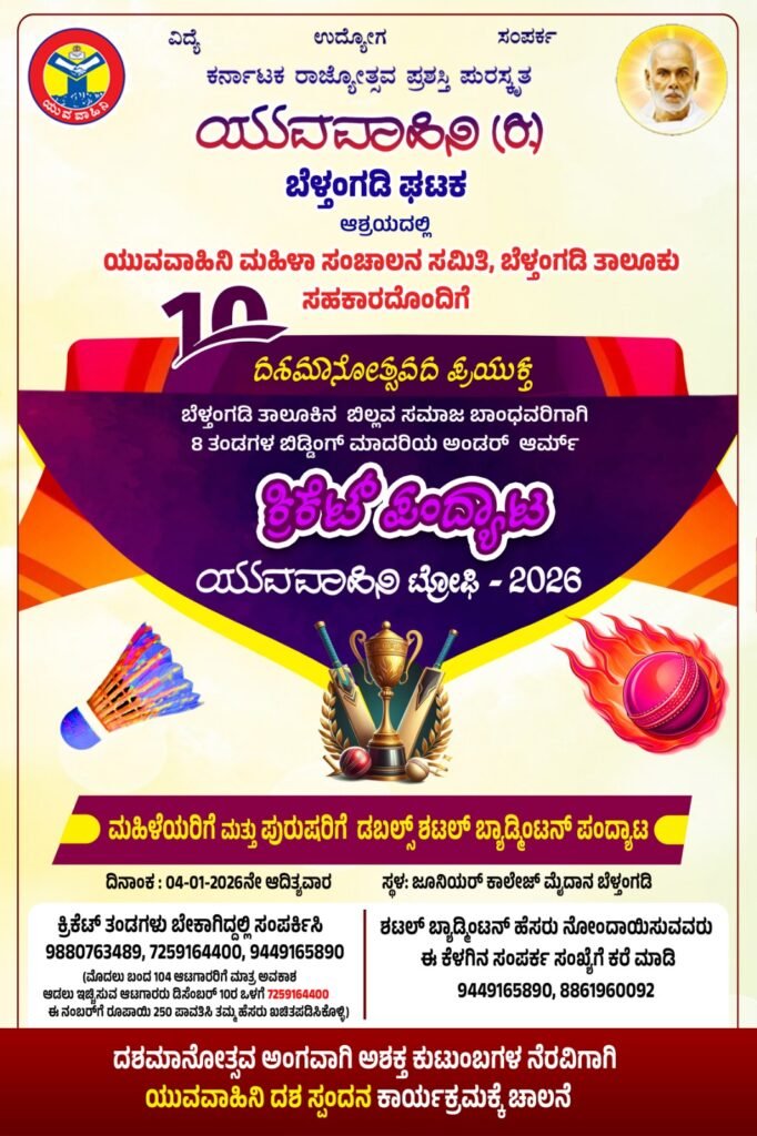 ಬೆಳ್ತಂಗಡಿ : ಯುವವಾಹಿನಿ (ರಿ.) ಬೆಳ್ತಂಗಡಿ ಘಟಕ ಆಶ್ರಯದಲ್ಲಿ ಯುವವಾಹಿನಿ ಮಹಿಳಾ ಸಂಚಾಲನ ಸಮಿತಿ ಬೆಳ್ತಂಗಡಿ ತಾಲೂಕು ಆತಿಥ್ಯದಲ್ಲಿ ದಶಮಾನೋತ್ಸವ ಪ್ರಯುಕ್ತ ಬೆಳ್ತಂಗಡಿ ತಾಲೂಕಿನ ಬಿಲ್ಲವ ಸಮಾಜ ಬಾಂಧವರಿಗೆ 8 ತಂಡಗಳ ಬಿಡ್ಡಿಂಗ್ ಮಾದರಿಯ ಅಂಡರ್ ಆರ್ಮ್ ಕ್ರಿಕೆಟ್ ಪಂದ್ಯಾಟ ಯುವವಾಹಿನಿ ಟ್ರೋಪಿ – 2026 ಜನವರಿ 04ರಂದು ಜೂನಿಯರ್ ಕಾಲೇಜು ಮೈದಾನದಲ್ಲಿ ನಡೆಯಲಿದೆ.